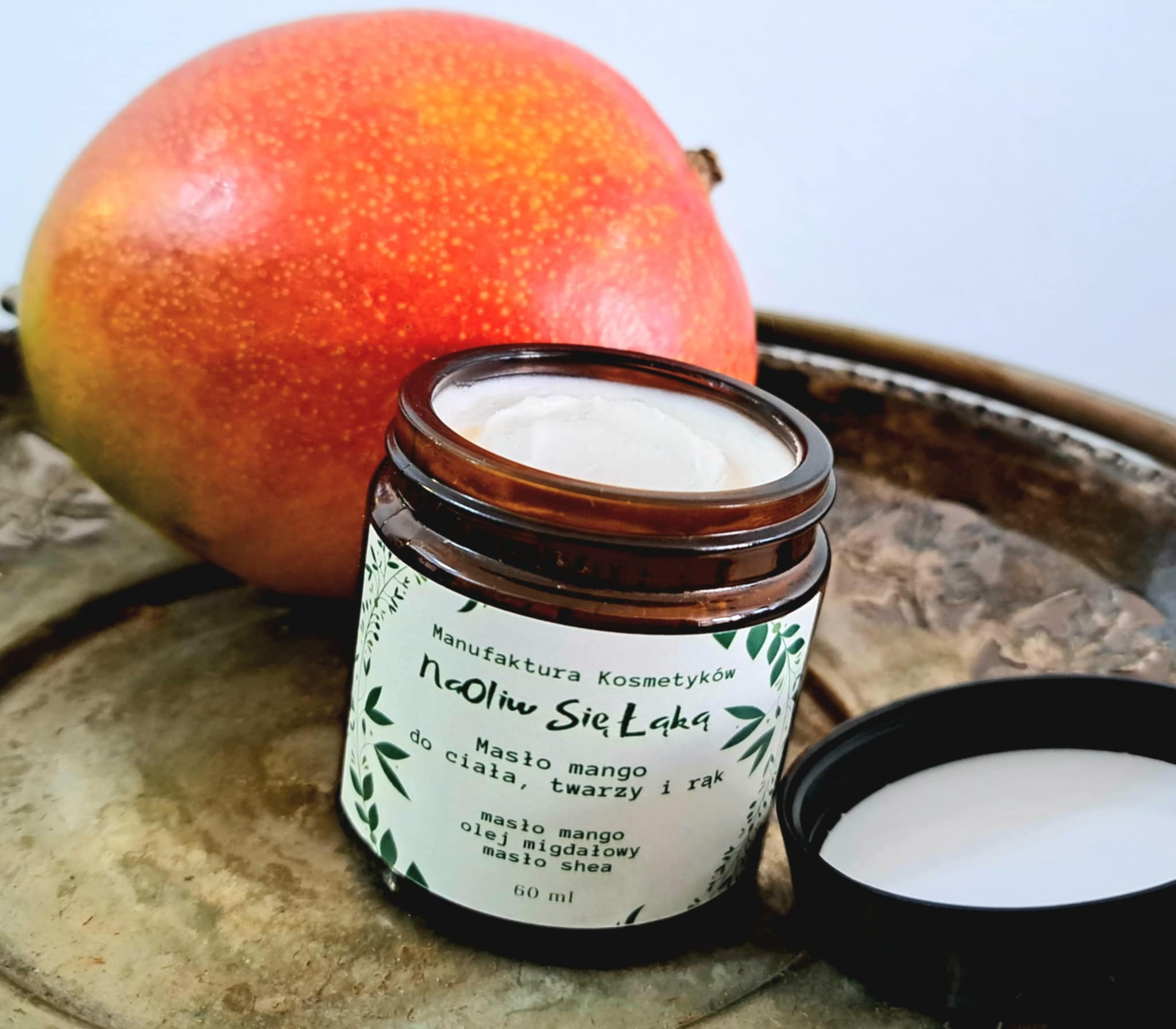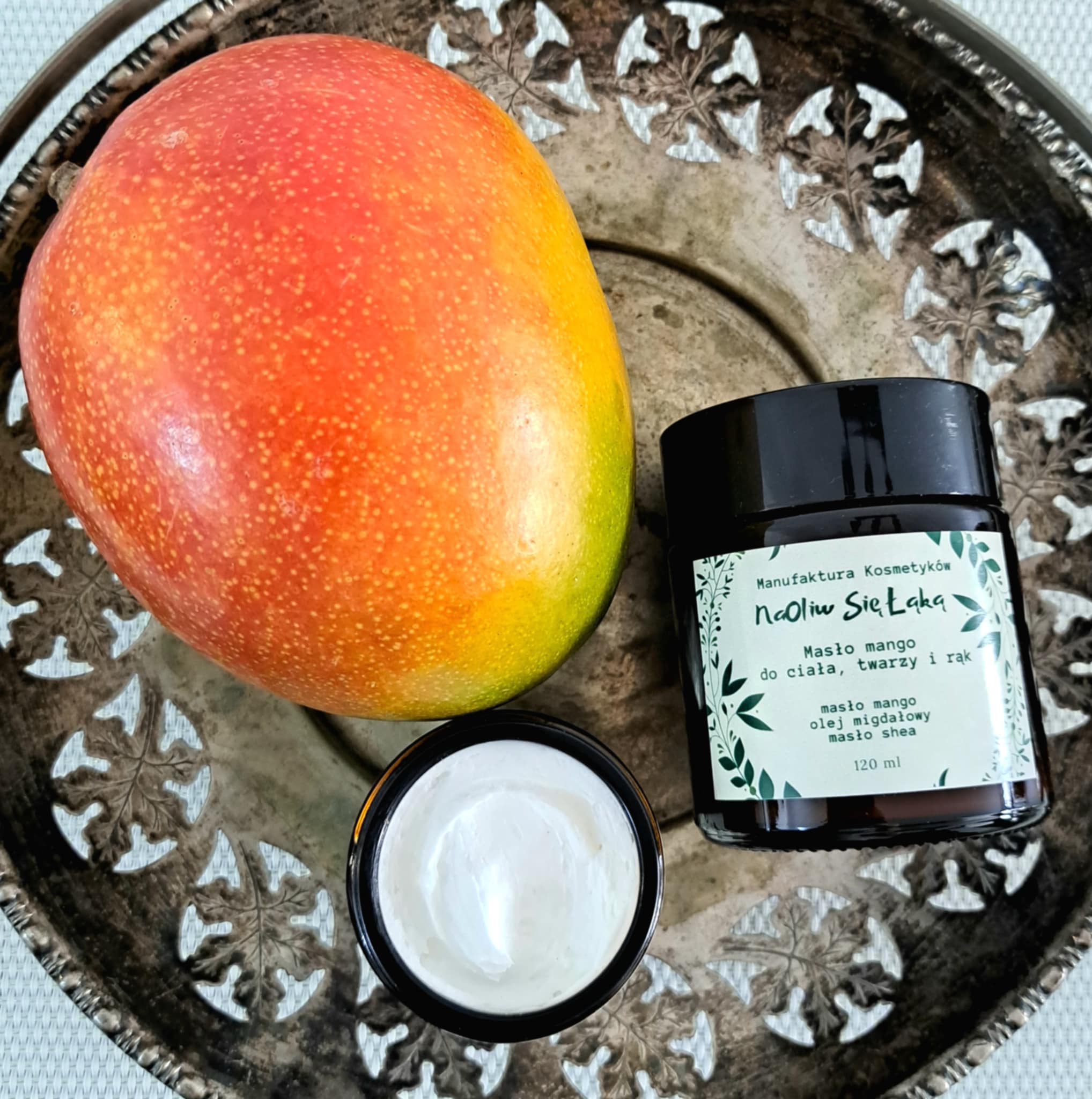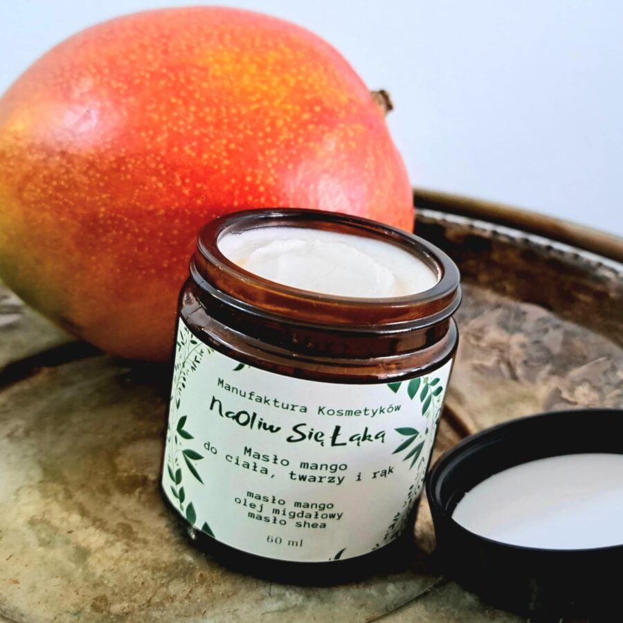 masło mango – koi, regeneruje, odżywia, dostarcza witamin, wspomaga procesy naprawcze skóry i zapobiega jej wysuszaniu, zawiera witaminę A i C